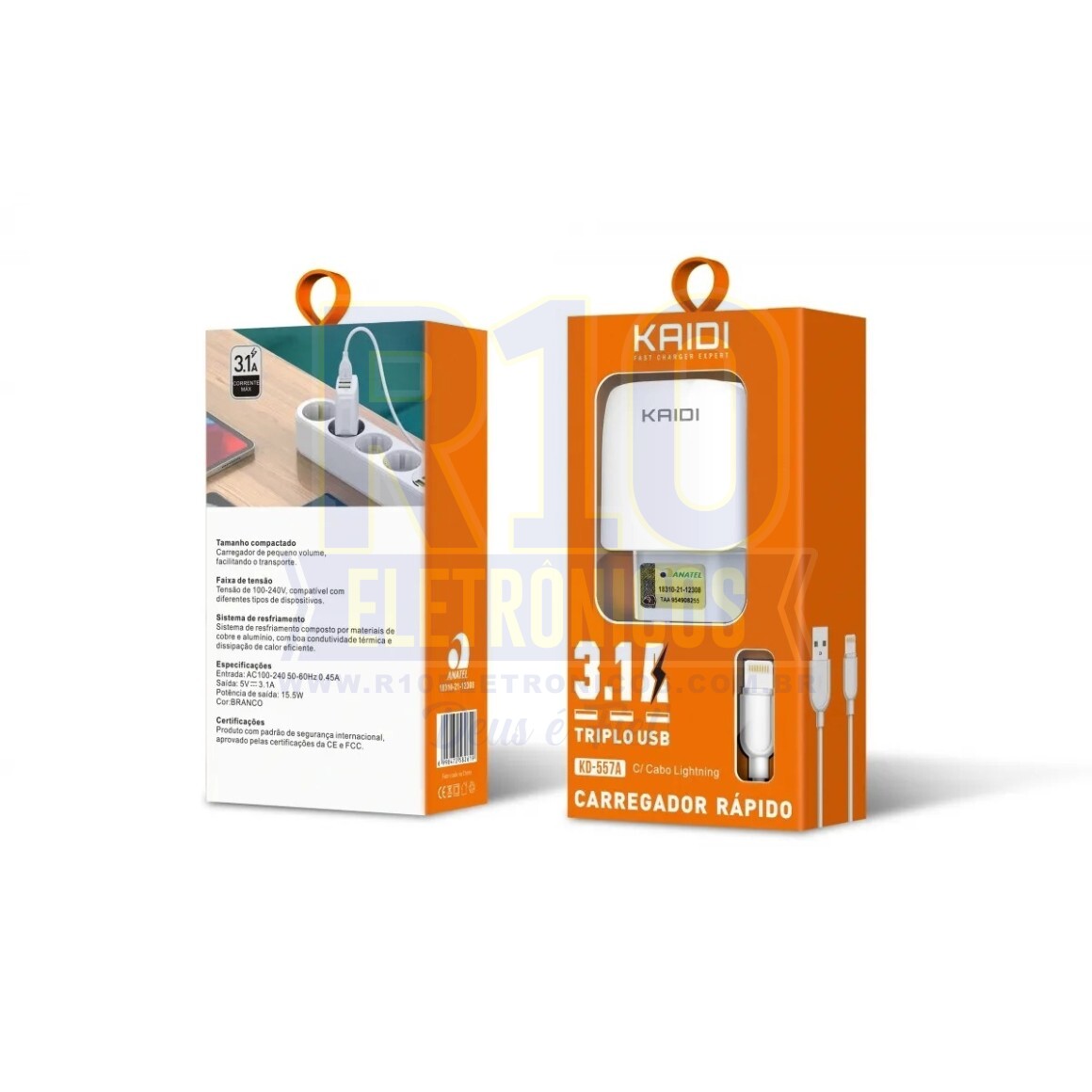 Possui um tipo de conector USB. A voltagem de entrada é de 110V/220V. A voltagem de saída é de 5V3.1A. Inclui cabo. Possui 3 portas de carga. Compatível com: IPHONE. Recarregue a bateria de seus dispositivos de forma rápida e eficiente. As imagens podem ser ilustrativas