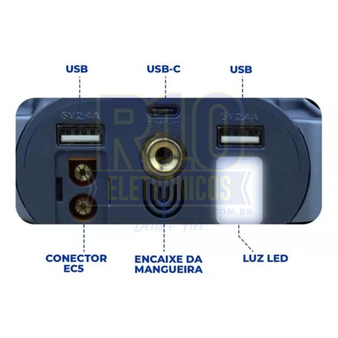 - Alimentação para recarga: 5Vdc/2A (fonte não inclusa)